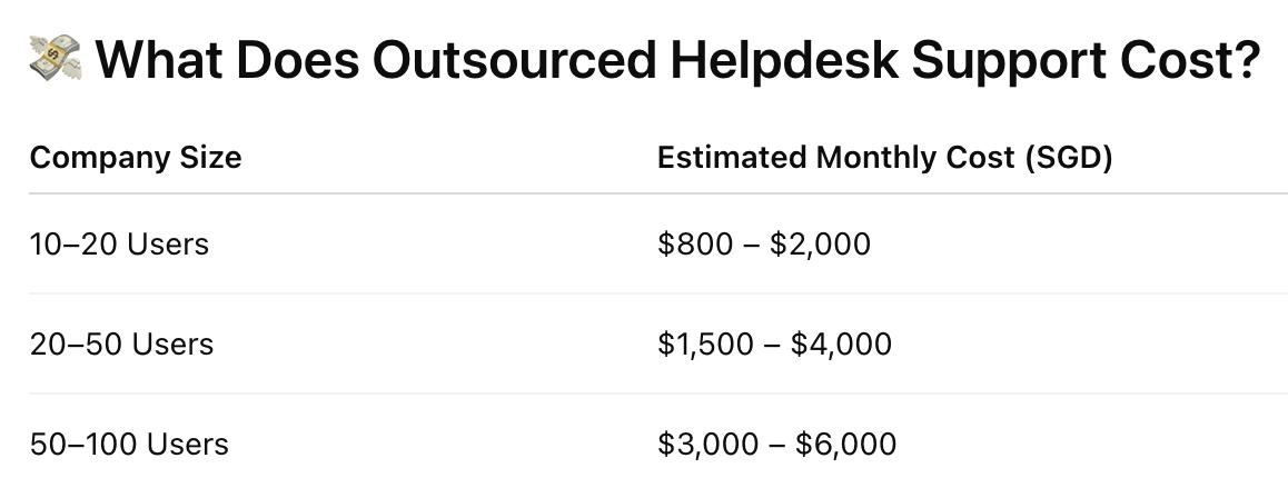 Compared to the cost of one full-time IT hire ($70k–$100k/yr), helpdesk outsourcing is far more cost-efficient for SMEs.